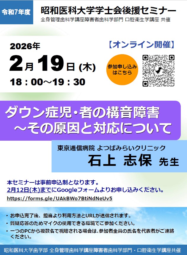 | 2月19日 | ダウン症児・者の構音障害〜その原因と対応について | 東京逓信病院 よつばみらいクリニック 石上 志保 先生 |